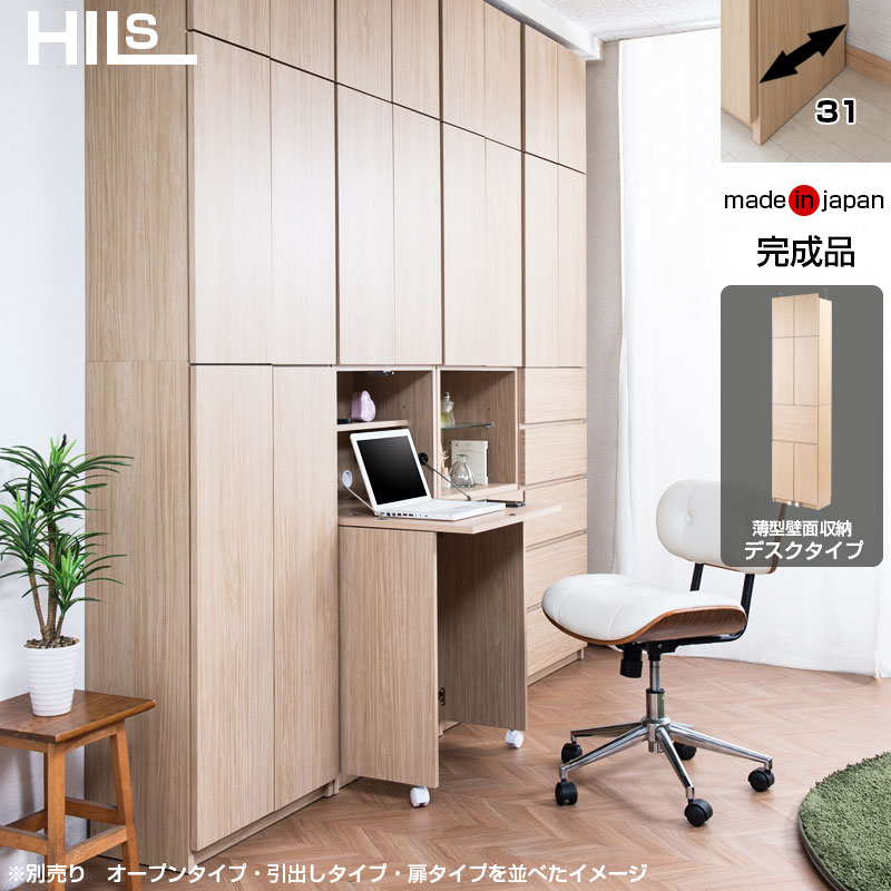 ■商品について/見せる・隠すを兼ねたシンプルモダン壁面収納HILLSシリーズ。用途に合わせて選べる備え付けの様な壁面収納4タイプ。木目が薄っすらある落ち着いたホワイトウォッシュカラー、雰囲気のある柔らかい表情のマリンナチュラルカラーの2カラー展開。扉には調節可能なスライド蝶番を採用し床のゆがみ等による扉の微妙な不揃いもスライド蝶番で調整できるので便利。薄型だけど天井にしっかりと突っ張って固定するので安心。また壁に穴を開ける事もなく賃貸マンション等でも設置可能。ディスプレイガラス棚を採用した見せる隠すの両立オープンタイプ、全て隠せる扉タイプ、引出し付きで出し入れしやすい引出しタイプ、格納式天板でデスクに見えないキャビネット型デスクの4種よりお選びいただけます。多機能・大量収納等良いとこ満載の壁面収納をシリーズを。