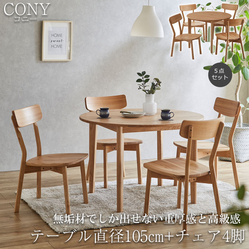 無垢材でしか出せない重厚感と高級感 【CONY】コニーシリーズ ダイニングテーブル 4人掛け 5点セット 円幅105cm ナチュラル 食卓テーブル 無垢 無垢材 おしゃれ デスク パソコンデスク カフェ 丸