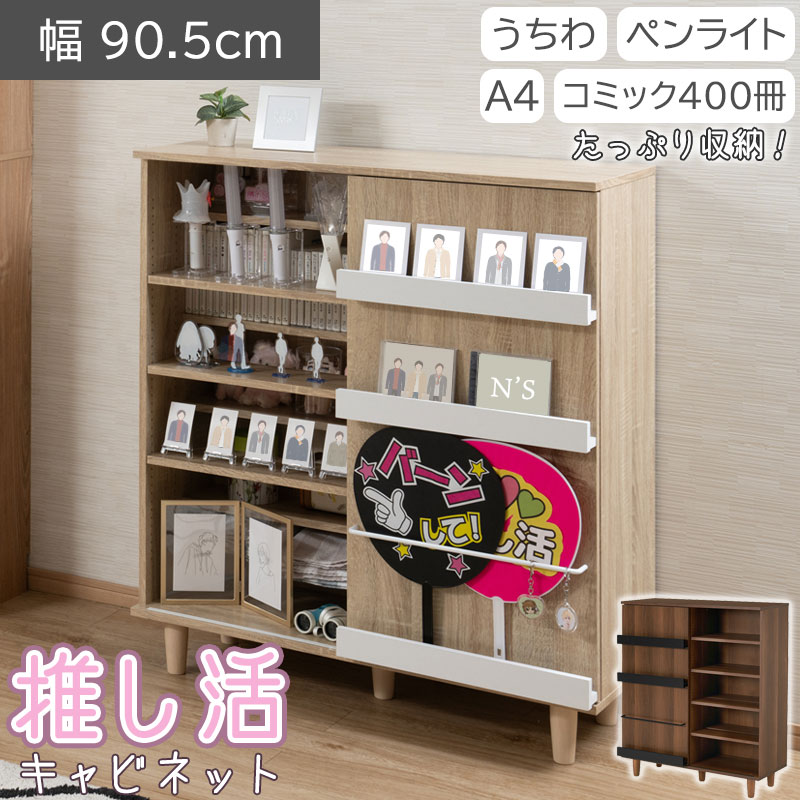 推し活うちわやチェキが飾れる片面スライド扉付!推し活キャビネット【LOVE】シリーズ ポテト 収納 キャビネット 幅90.5 ブックシェルフ 本棚 コミックラック 漫画収納 2列 ラック ナチュラル ブラウン 扉付き 大容量 ちびぬい ペンライト
