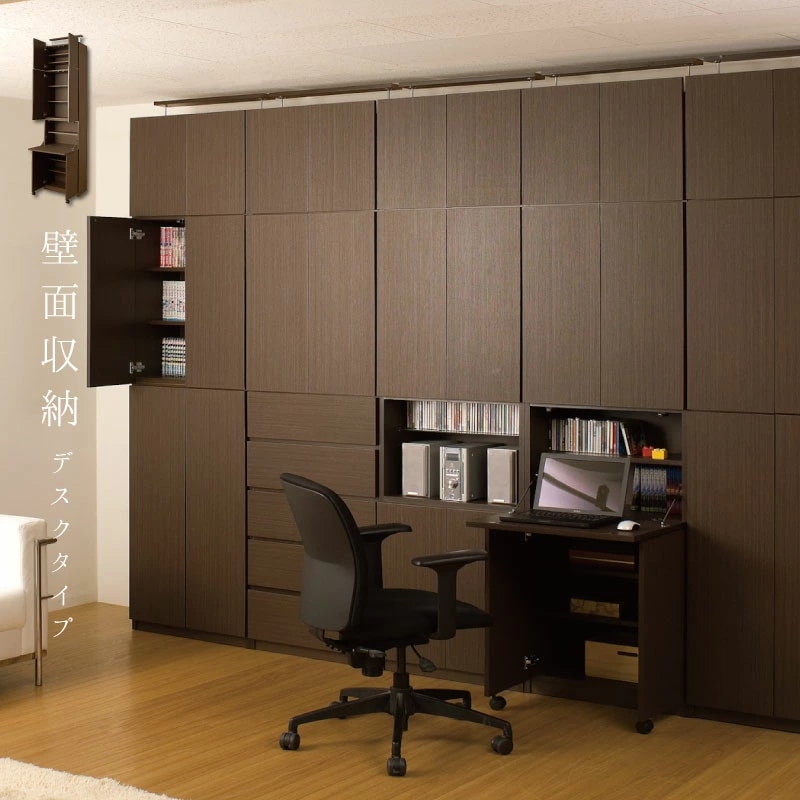 ■商品について/更に収納力が増した新リニューアル!見せる・隠すを兼ねたシンプル・モダン壁面収納【ATRAS】アトラスシリーズ。用途に合わせて選べる備え付けの様な壁面収納4タイプ。薄型だけど天井にしっかりと突っ張って固定するので安心。また壁に穴を開ける事もなく賃貸マンション等でも設置可能。ディスプレイガラス棚を採用した見せる隠すの両立オープンタイプ、全て隠せる扉タイプ、引出し付きで出し入れしやすい引出しタイプ、格納式天板でデスクに見えないキャビネット型デスクの4種よりお選びいただけます。多機能・大量収納等良いとこ満載の壁面収納をシリーズを。