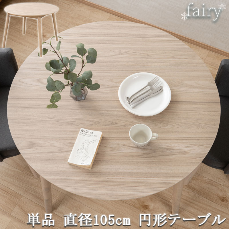 ■商品について/全体をアースカラーでまとめた、フェミニンな優しいアースカラーの【fairy】シリーズ。ダイニングテーブルは、直線と曲線の融合で高級感のある仕上がりに。直径105cmとコンパクトなので、一人暮らしの方でも使いやすいです。落ち着いたベージュのダイニングテーブルで、木の温もりと共に囲む団らんのひとときをお楽しみください。