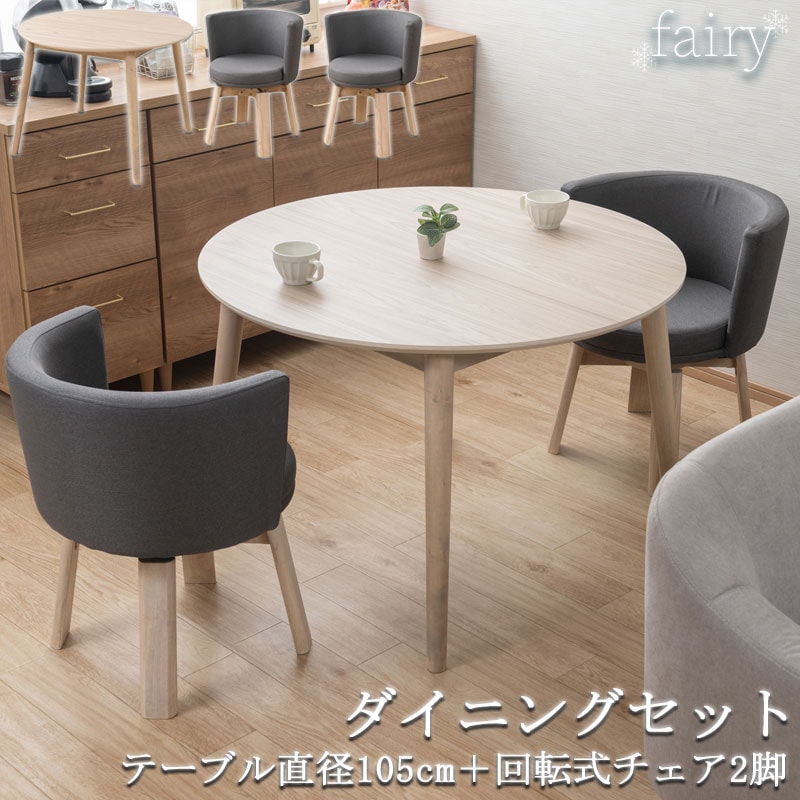 【fairy】シリーズ ダイニング3点セット 2人用 2人掛け 幅105cm 丸テーブル 机 デスク ナチュラル 円形 半円 丸 木目 座面高43cm チェア 椅子 イス 2脚 天然木脚 360度回転 ダイニングセット グレー リビング ダイニング