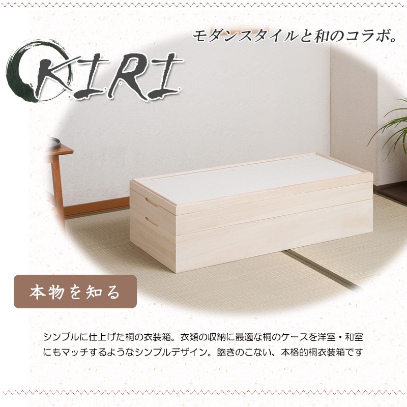■商品について/取っ手金物のないシンプルに仕上げたモダンな印象の桐衣装箱。洋室などのフローリングにも合うデザインで和室だけでなく幅広いシーンにはまります。桐材は内部を一定の湿度に保とうとする働きがあるので大事な着物や洋服などを湿気から守る桐箱にしまうのがベスト。内部には竹炭シートを施しているので、消臭効果もプラス!クローゼット上などコンパクトな1段タイプからラインナップし、着物や浴衣、洋服など長期保管に最適です。蓋は印籠式を採用により密閉性を高めた仕様で15mm厚の頑丈なつくりはもちろん、その構造だからできる繊細で優雅なデザイン。買い足し積み重ねができるので増える着物と洋服をしっかり収納。