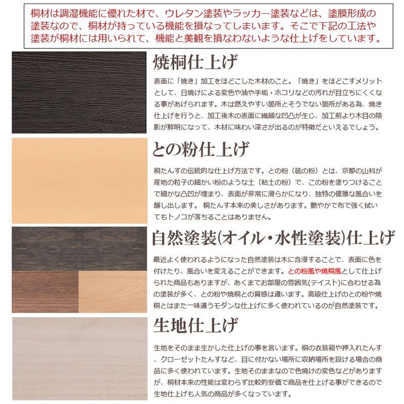 ■商品の仕様/本体:天然木桐材(浮造り仕上げ・オイル塗装)、引出し底板・背板:天然木桐化粧板、民芸金具:亜鉛ダイキャスト