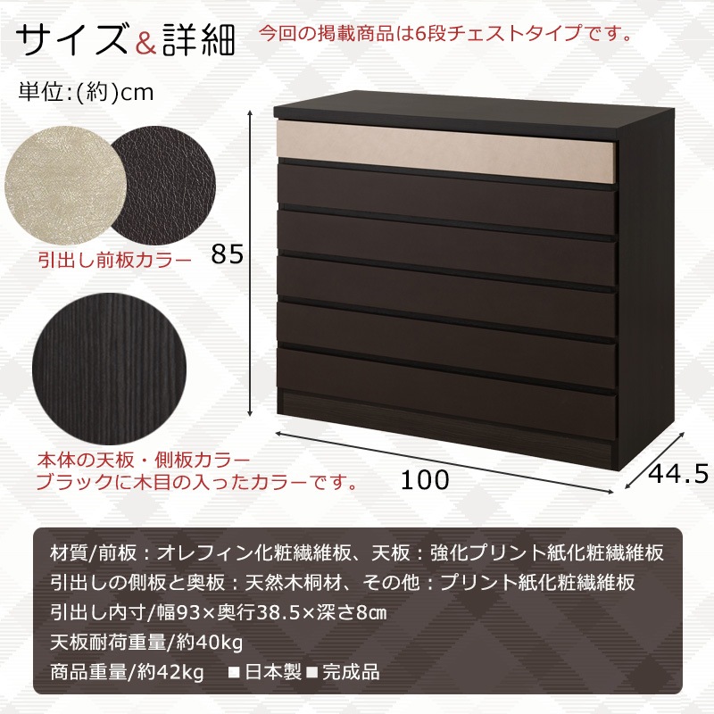【G.D.】 幅100 奥行44.5 高さ85cm 新モデルリニューアル 上質な素材にこだわったモダン桐チェスト 6段 日本製 完成品 ハイタイプ ハイチェスト ブラック レザー調 ゴールド メタル 着物収納 着物 箪笥 おしゃれ