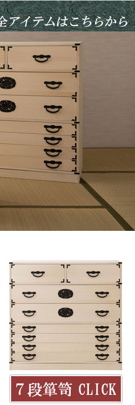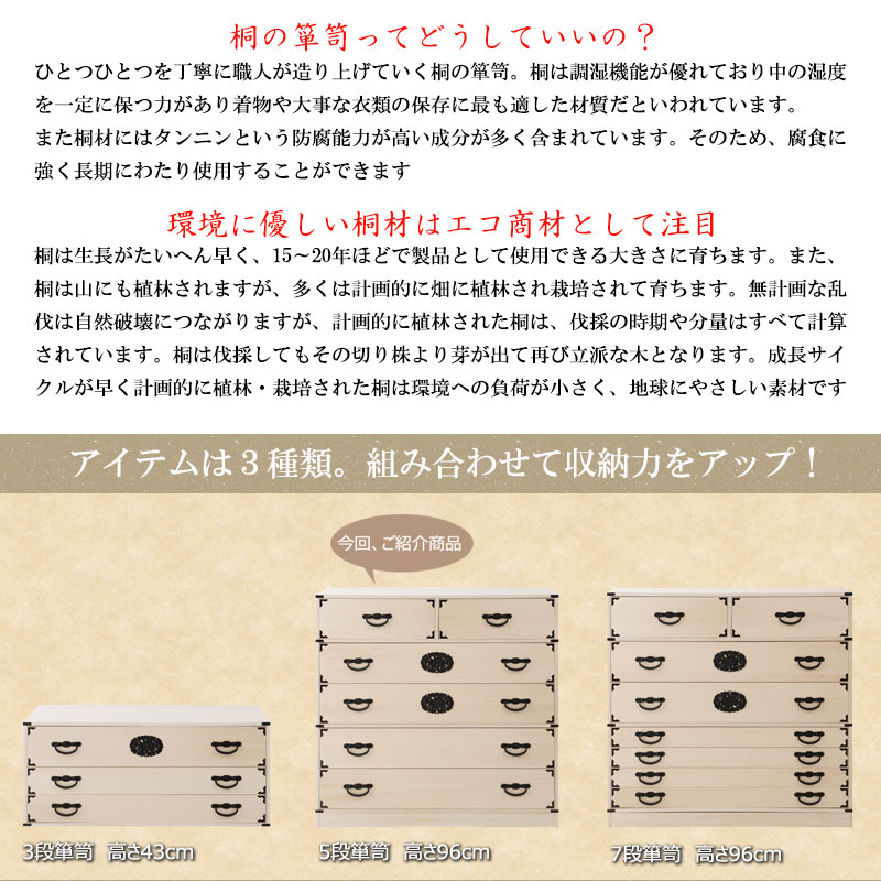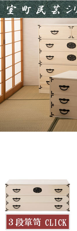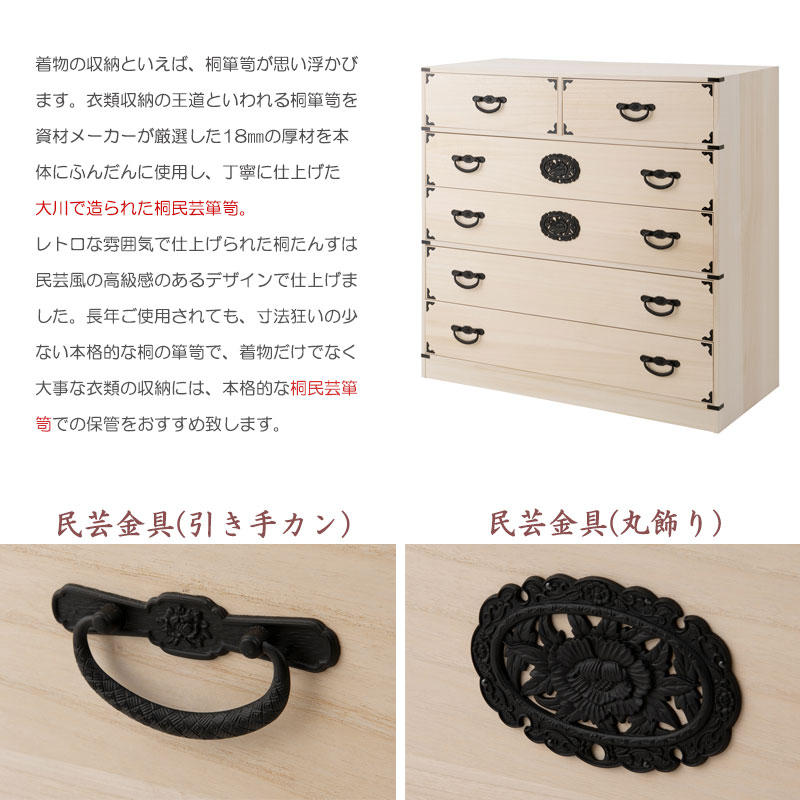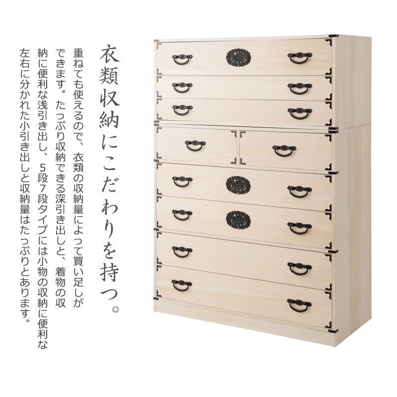 ■商品について/民芸箪笥といえば欅材をイメージしますが、『室町』は調質効果・防虫効果の高い桐材で仕上げ、風格は民芸箪笥を再現しました。単なる収納という目的だけでなく効果的に収納物を守るという機能的な一面も合わせ持った民芸調総桐箪笥『室町』。桐材は欅のようなハードな木目をおさえ、緩やかで優しい表情になることで和室はもちろん洋室などのフローリングにも合うデザインに仕上げました。重厚な引手と木目のバランスが奇抜すぎず、モダンな印象の室町はデザイン性の高い現代の住宅インテリアに合う。桐材は内部を一定の湿度に保とうとする働きがあるので大事な着物や洋服などを湿気から守る桐箪笥にしまうのがベストで着物や浴衣、洋服など長期保管に最適です。経年変化の風合いを楽しめる白木タイプ、ナチュラルの塗装仕上げタイプと2カラーをご用意。