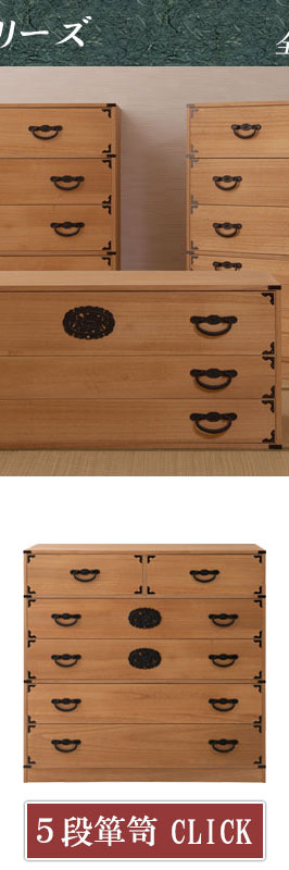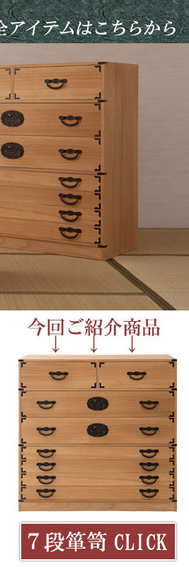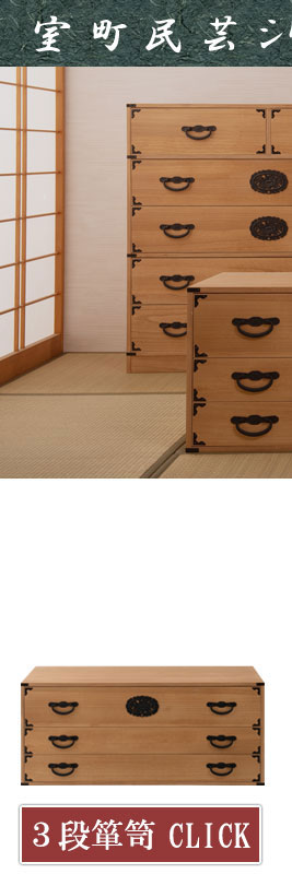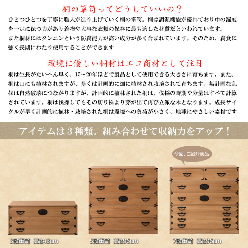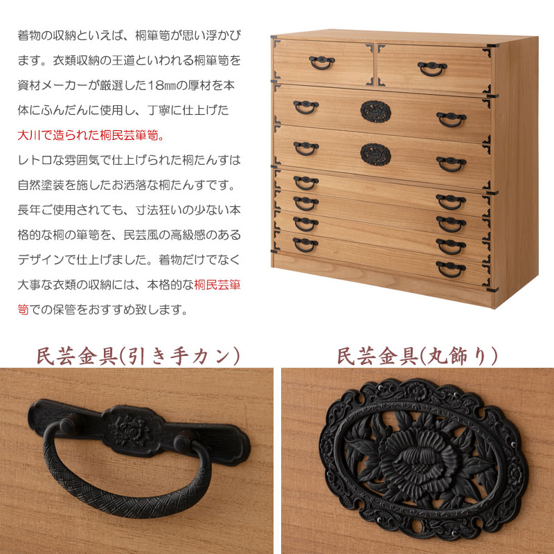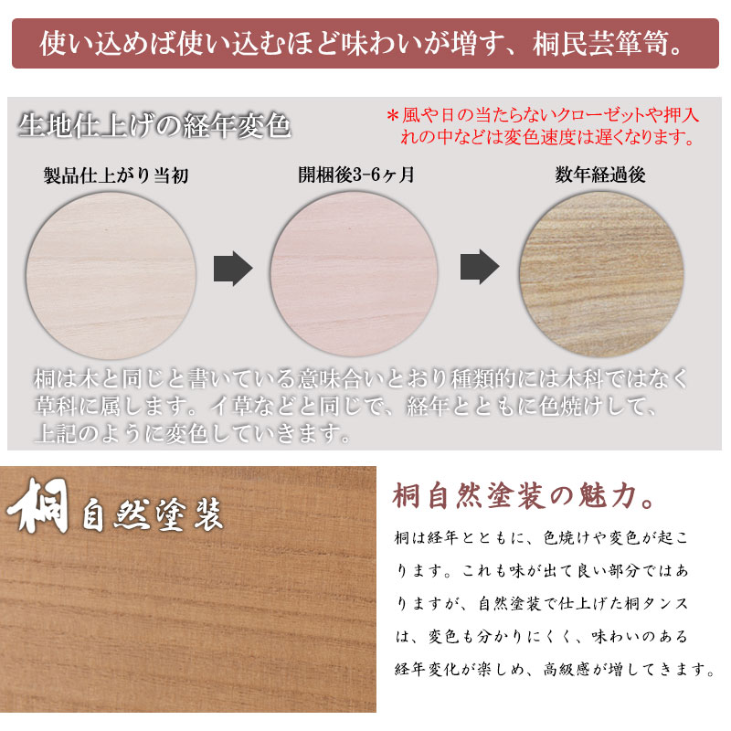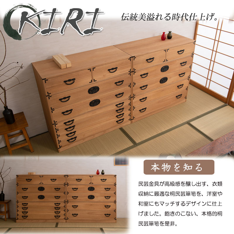 ■商品について/民芸箪笥といえば欅材をイメージしますが、『室町』は調質効果・防虫効果の高い桐材で仕上げ、風格は民芸箪笥を再現しました。単なる収納という目的だけでなく効果的に収納物を守るという機能的な一面も合わせ持った民芸調総桐箪笥『室町』。桐材は欅のようなハードな木目をおさえ、緩やかで優しい表情になることで和室はもちろん洋室などのフローリングにも合うデザインに仕上げました。重厚な引手と木目のバランスが奇抜すぎず、モダンな印象の室町はデザイン性の高い現代の住宅インテリアに合う。桐材は内部を一定の湿度に保とうとする働きがあるので大事な着物や洋服などを湿気から守る桐箪笥にしまうのがベストで着物や浴衣、洋服など長期保管に最適です。経年変化の風合いを楽しめる白木タイプ、ナチュラルの塗装仕上げタイプと2カラーをご用意。