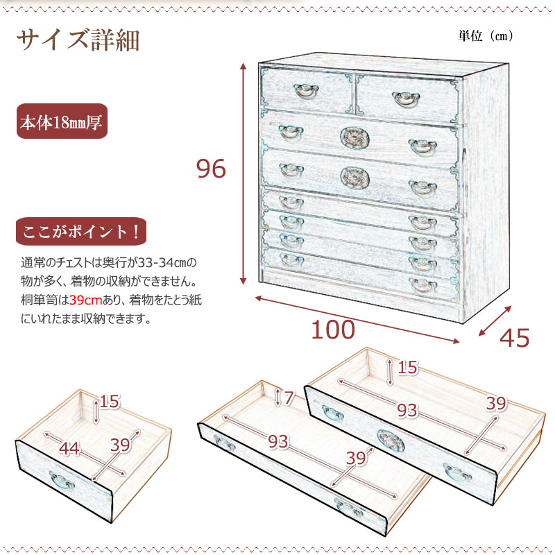 ■商品の仕様/本体:天然木桐材(水性塗装)、引出し底板・背板:天然木桐化粧板、装飾金物:ダイカスト