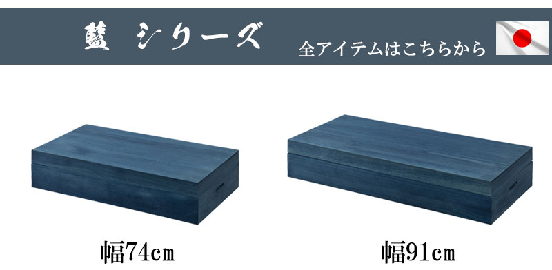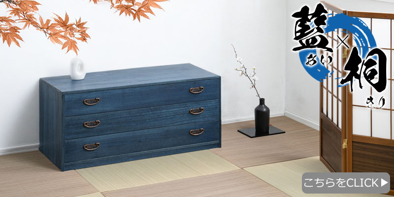 ■商品について/【AI】シリーズは、その独特な色合いや質感が魅力的で、インテリアに取り入れると落ち着きのある上品な雰囲気を演出でき、色のアクセントとして使用することができます。総桐で知られる衣装箱は天然木桐材の特性である吸湿性・保湿性の高さや含有成分のタンニン・セサミンにより抗菌・ 防腐効果が期待できます。防虫効果もあり桐材は衣類収納に長けています。 また密度が低く空気を多く含み空気の層が熱を遮断し優れた断熱効果があり、表面が焼け焦げても内部までは火が回りにくい。貴重品を守る金庫にも使われているというのは有名な話。その総桐衣装箱に藍塗装を施し、デザイン性を高め風情あるブルーに仕上げました。藍の深い青色は、インテリアにおいて落ち着いたアクセントカラーとして非常に効果的です。藍の衣装箱を使うことで、美しく整理整頓することができ、シンプルでありながら洗練された印象を与えることができます。藍の衣装箱を使用して、和風のテイストを取り入れたインテリアを作ることができます。藍塗装の衣装箱の落ち着いた色合いと、シンプルで直線的なデザインがモダン・ミニマルなインテリアにもよく合います。特に、白やグレーを基調とした部屋に藍の衣装箱の家具を取り入れると、洗練された雰囲気が漂います。藍塗装の桐の商品はその色彩と素材の特性を空間に落ち着きと温かみを与えるアイテムです。どんなインテリアにも柔軟に調和し、長く使い込むことで味わいが増すので、時間とともにその美しさを楽しむことができます。