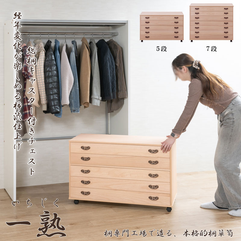 柿渋仕上げ 【一熟】 浮造り仕上げの総桐チェスト 5段 7段 幅99.5 奥行44 日本製 完成品 和室 洋室 着物 帯 桐 桐箪笥 タンス 和ダンス 和タンス 収納ケース 引き出し 引出し 大川家具 整理タンス 整理ダンス 総桐 キャスター付