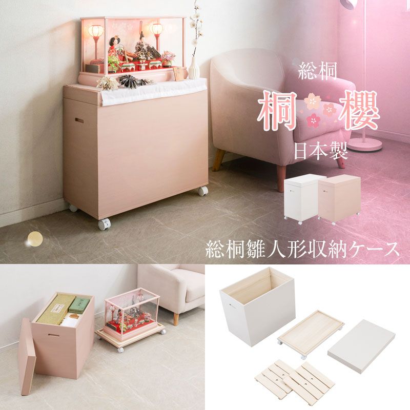 【桐櫻 総桐雛人形収納ケース】 高さ60.5cm 奥行60.5 日本製 国産 ピンク ホワイト 押入れ 雛人形 人形 親王飾り 雛人形ケース 押入れ ひな人形 総桐衣装箱 桐の衣装ケース 衣裳ケース 桐箱 キャスター付 民芸 桐たんす 桐箪笥 桐タンス