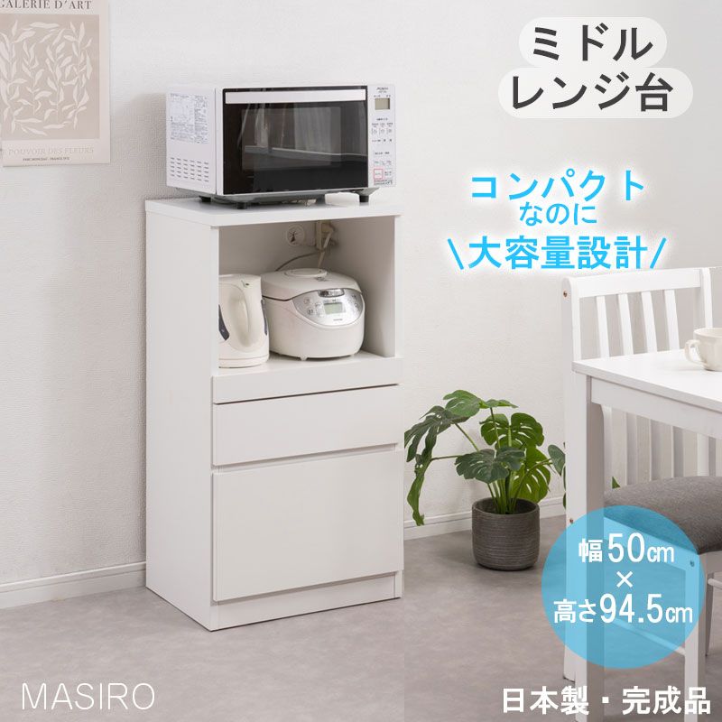 新リニューアル引出しレール付きにパワーアップ!【masiro】レンジ台 幅50cm ニューミドルタイプ 日本製 完成品 ホワイト スライド レンジボード 大容量 キッチンラック レンジラック 台所 おしゃれ ダイニングボード キッチンボード 家電収納 家電ラック 隙間収納 すき間