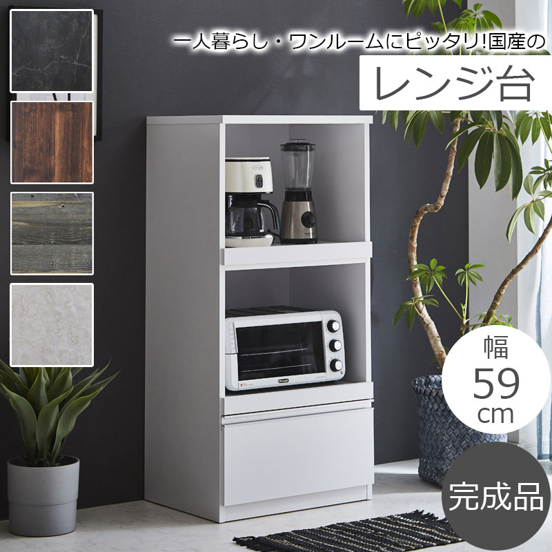 一人暮らし・ワンルームにピッタリ!コンパクトなレンジ台 キッチンカウンター 幅59 奥行46 高さ123 日本製 国産 完成品 ブラック 黒 ホワイト 白 シャビ―ホワイト グレー ストーングレー ウォールナット ブラウン 茶 大理石 大理石調 木目